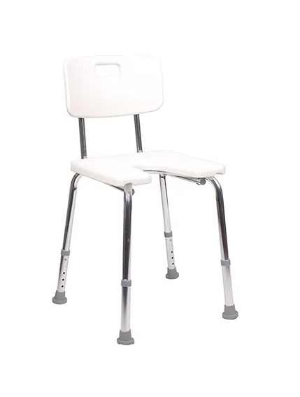 Cadeira completa com encosto em plástico. O assento em forma de ferradura facilita a higiene íntima. Foi especialmente concebido para ser utilizado na casa de banho. Suas pernas extensíveis permitem ajustar a altura do assento e suas pontas de borracha lhe conferem grande estabilidade.
